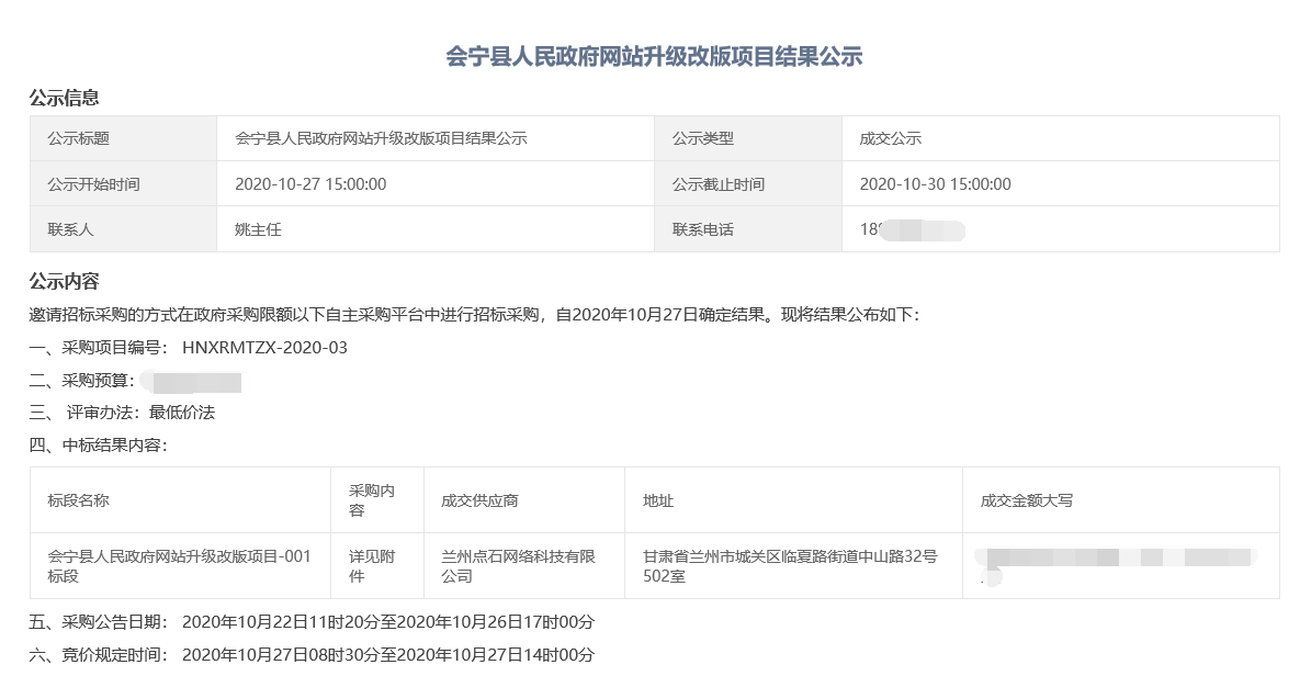 2020年10月,我司參加“會寧縣人民政府網(wǎng)站升級改版項目”招標會,在投標過程中以良好的信譽、豐富的行業(yè)經(jīng)驗、強大的技術實力以及優(yōu)秀的項目實施方案獲得了評標專家組的一致認可,以最佳的成績順利中標。