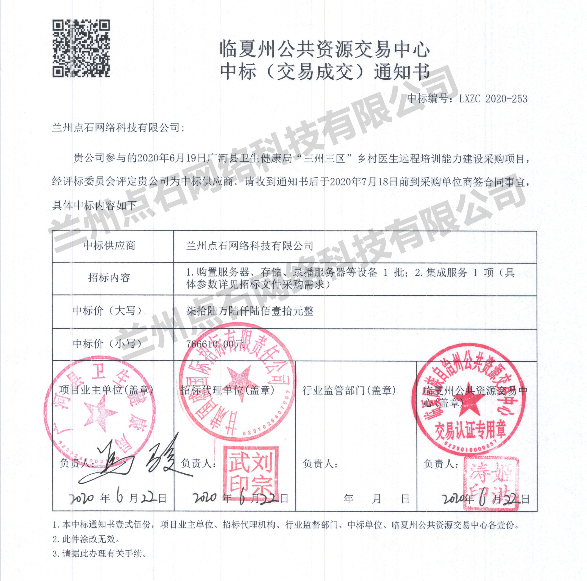 蘭州點石網(wǎng)絡科技有限公司近日捷報頻傳,繼2020年6月17日中標永靖縣醫(yī)療衛(wèi)生“一站式”服務和區(qū)域遠程醫(yī)療中心建設項目后,一鼓作氣,乘勝追擊,憑借良好的公司信譽和可靠的技術力量,成功中標廣河縣衛(wèi)生健康局“三州三區(qū)”鄉(xiāng)村醫(yī)生遠程培訓能力建設采購項目。
