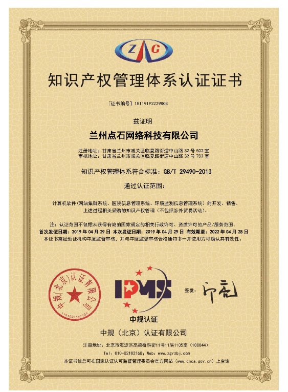 經(jīng)過(guò)點(diǎn)石家人近一年的不懈努力,終于拿到知識(shí)產(chǎn)權(quán)管理體系認(rèn)證證書(認(rèn)證范圍:網(wǎng)站群管理系統(tǒng)、醫(yī)院管理系統(tǒng)、環(huán)境監(jiān)測(cè)系統(tǒng)的開(kāi)發(fā)和銷售)。本認(rèn)證體系的通過(guò)標(biāo)志著蘭州點(diǎn)石公司的軟件開(kāi)發(fā)能力和規(guī)范化管理能力又向前邁進(jìn)了一大步?。ˋD:全省目前通過(guò)本體系認(rèn)證的信息化企業(yè)不足5家)