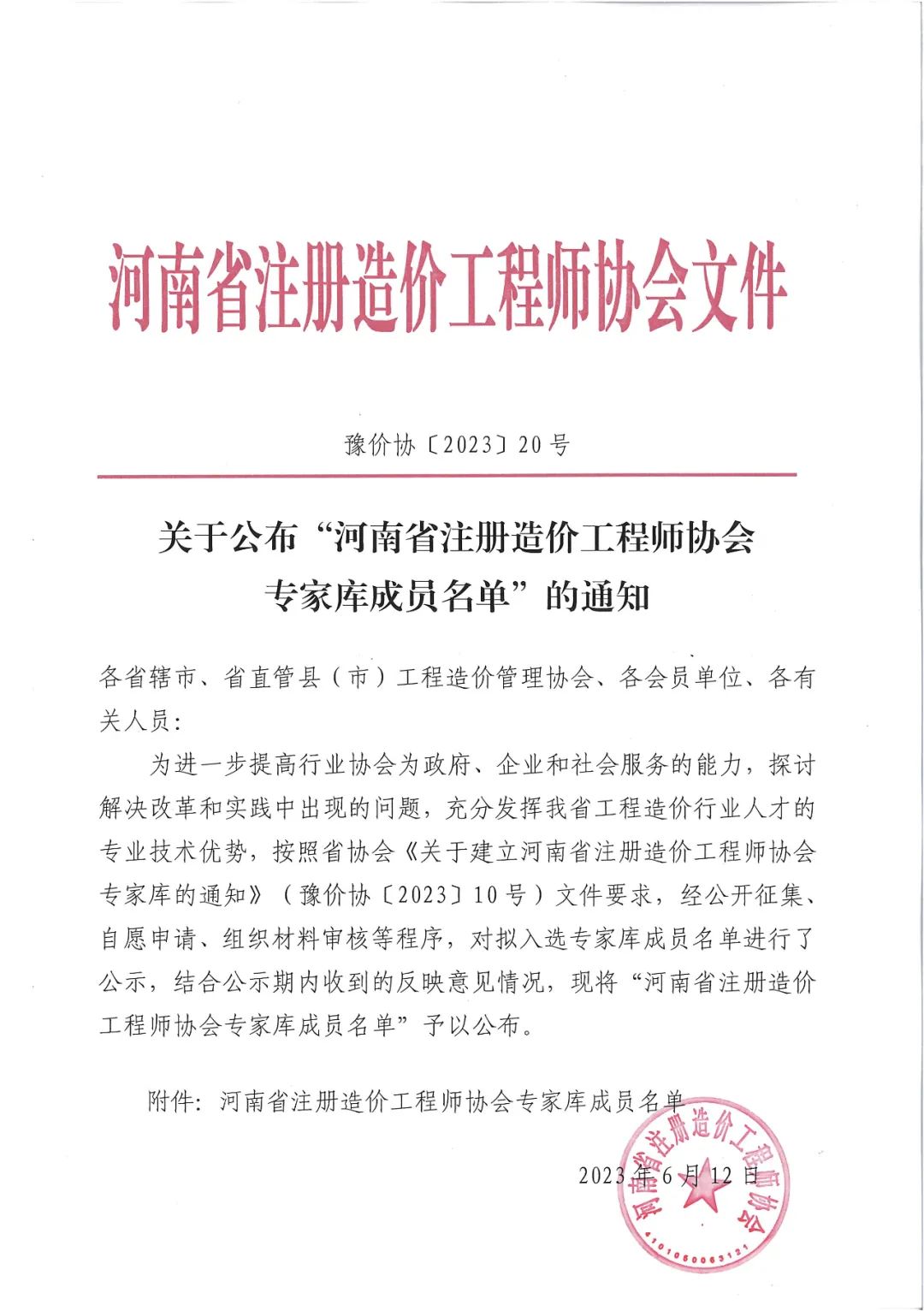 6月12日,河南省注冊造價(jià)工程師協(xié)會(huì)公布了“河南省注冊造價(jià)工程師協(xié)會(huì)專家?guī)斐蓡T名單”的通知,我公司賈世軍、李杰、徐文3名注冊造價(jià)師順利入圍專家?guī)?/span>。
