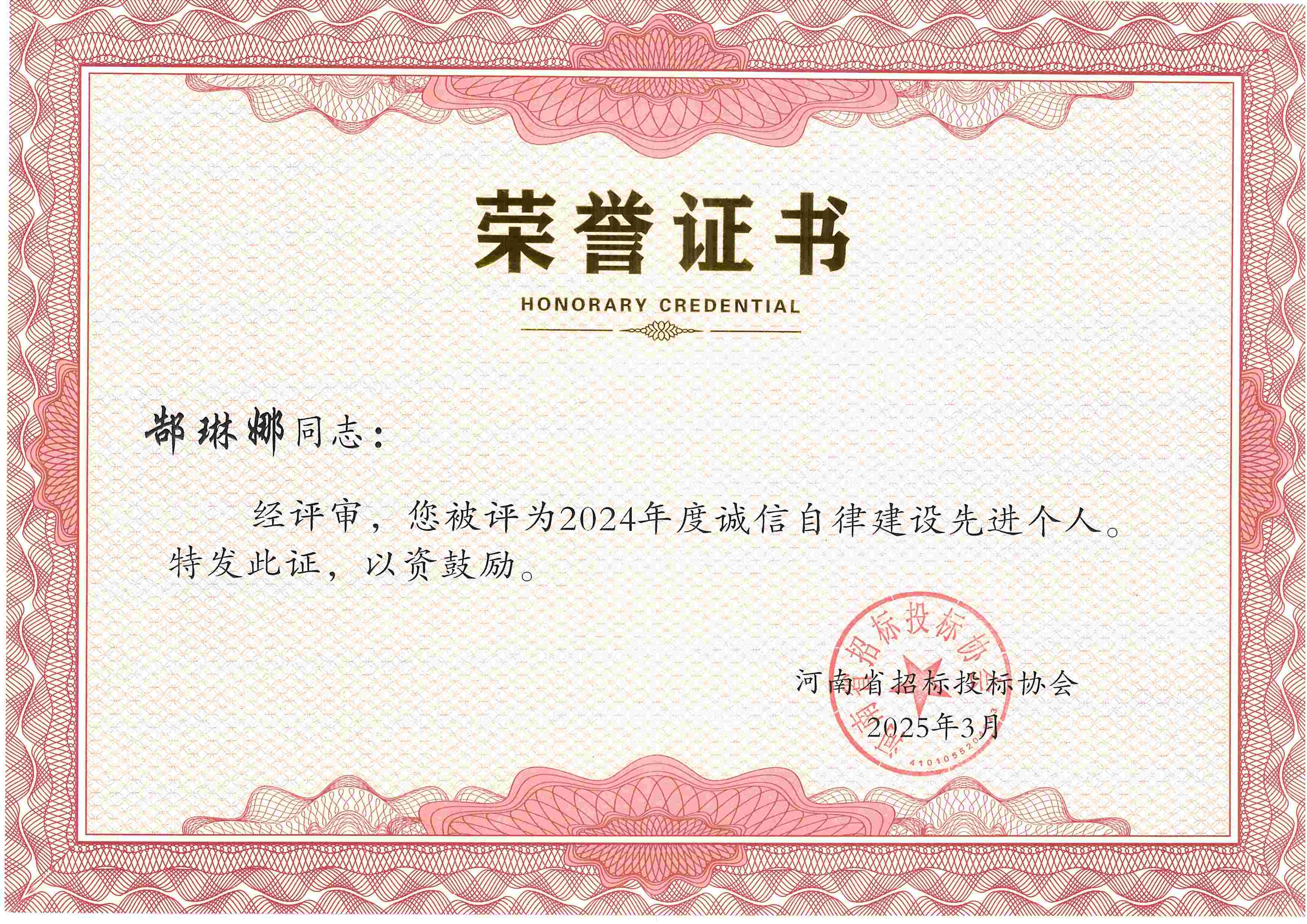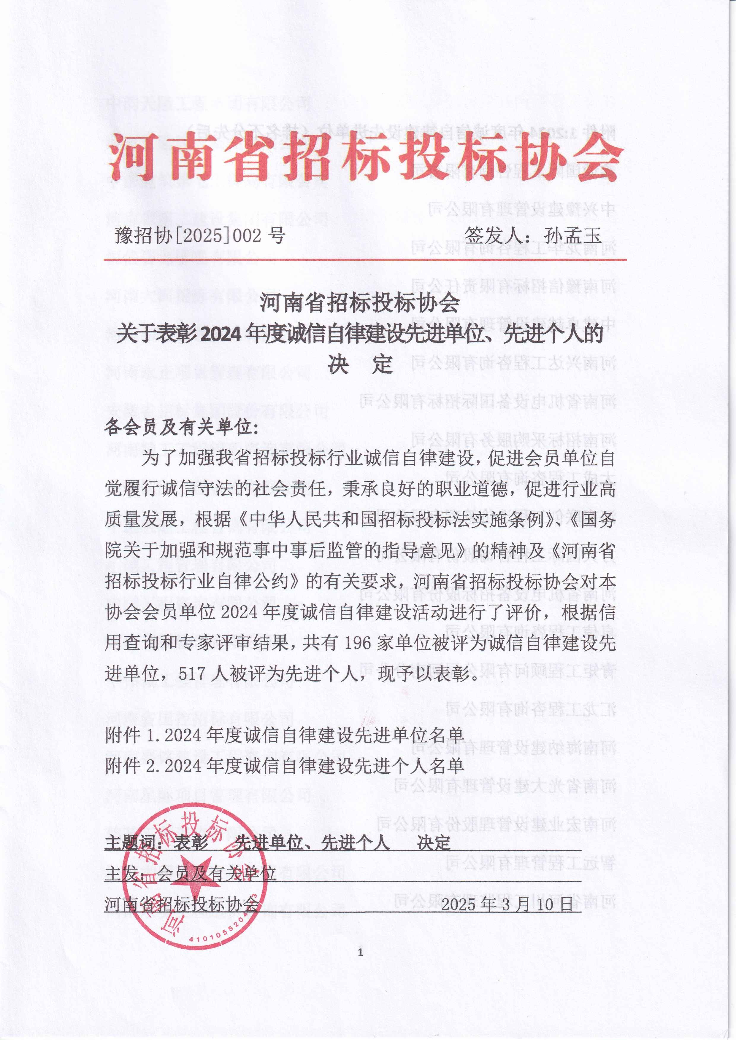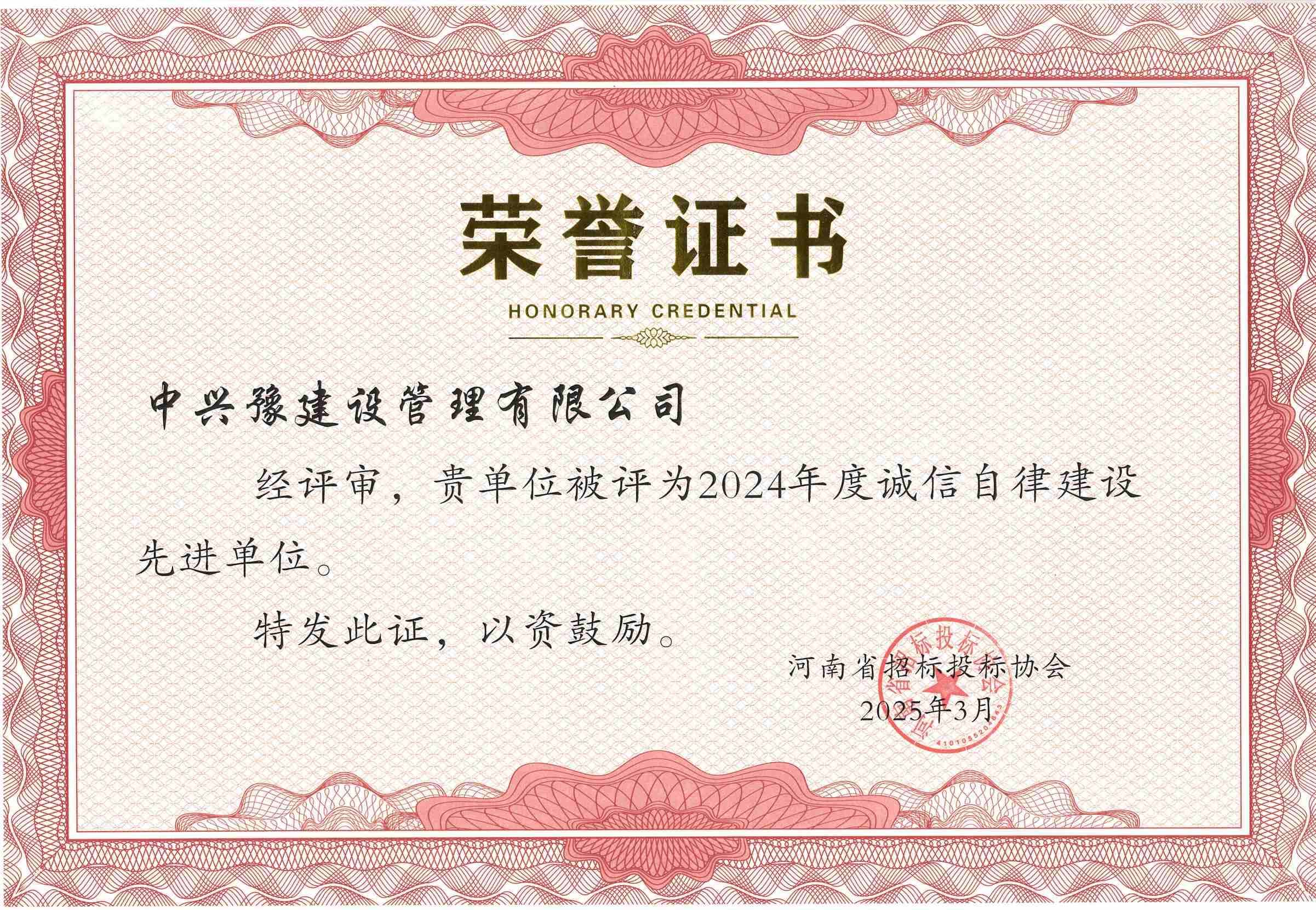 近日,河南省招標(biāo)投標(biāo)協(xié)會發(fā)布關(guān)于表彰2024年度誠信自律建設(shè)先進單位、先進個人的決定。其中,中興豫建設(shè)管理有限公司榮幸入選“2024年度誠信自律建設(shè)先進單位”。