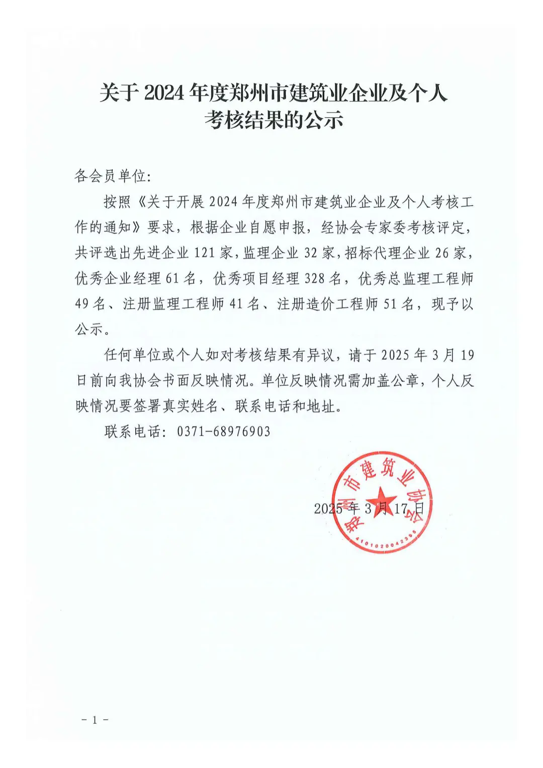 近日,鄭州市建筑業(yè)協(xié)會(huì)發(fā)布關(guān)于2024年度鄭州市建筑業(yè)企業(yè)及個(gè)人考核結(jié)果的公示。其中,中興豫建設(shè)管理有限公司榮幸入選“鄭州市建筑業(yè)優(yōu)秀監(jiān)理企業(yè)”、“鄭州市建筑業(yè)優(yōu)秀招標(biāo)代理企業(yè)”。