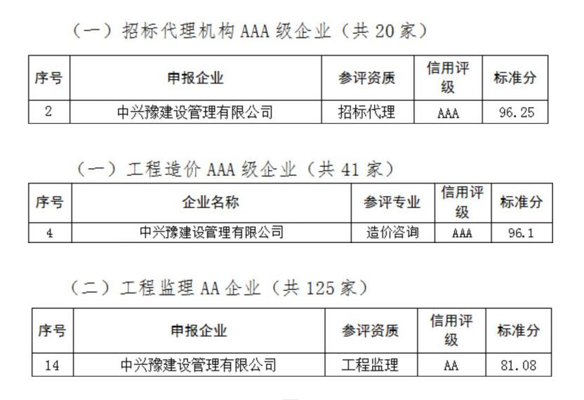 9月27日,鄭州市城鄉(xiāng)建設(shè)局發(fā)布了《關(guān)于2022年度鄭州市建筑企業(yè)信用評價(jià)結(jié)果的通告》,經(jīng)企業(yè)申報(bào)、主管部門審核、信用評價(jià)成員單位共同認(rèn)定及網(wǎng)上公示,中興豫建設(shè)管理有限公司被評為“招標(biāo)代理機(jī)構(gòu)AAA級企業(yè)”、“工程造價(jià)AAA級企業(yè)”、“工程監(jiān)理AA級企業(yè)”。