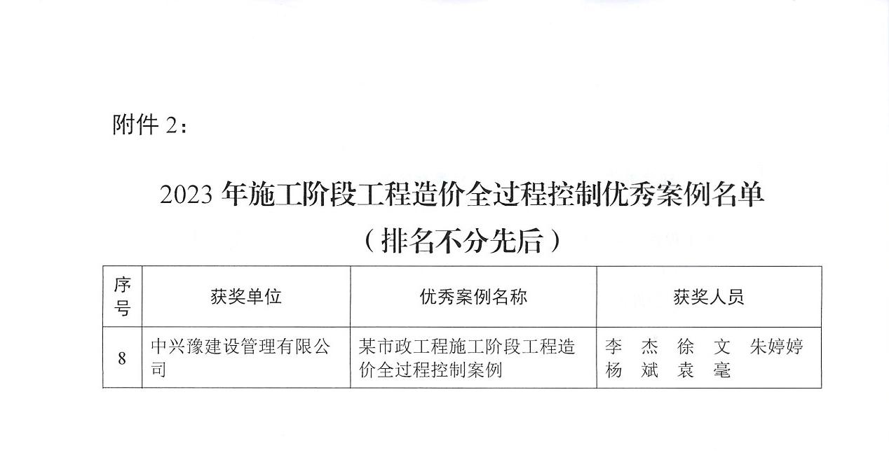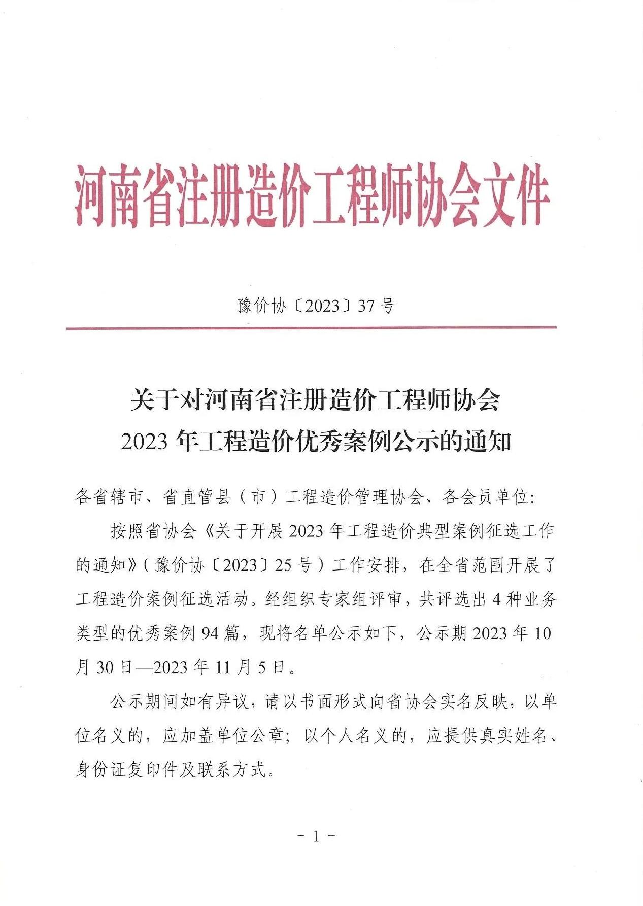 10月30日,10月30日,河南省注冊造價工程師協(xié)會公布了“河南省注冊造價工程師協(xié)會2023年工程造價優(yōu)秀案例公示的通知”,由中興豫建設(shè)管理有限公司負責(zé)的“某市政工程施工階段工程造價全過程控制案例”項目榜上有名。