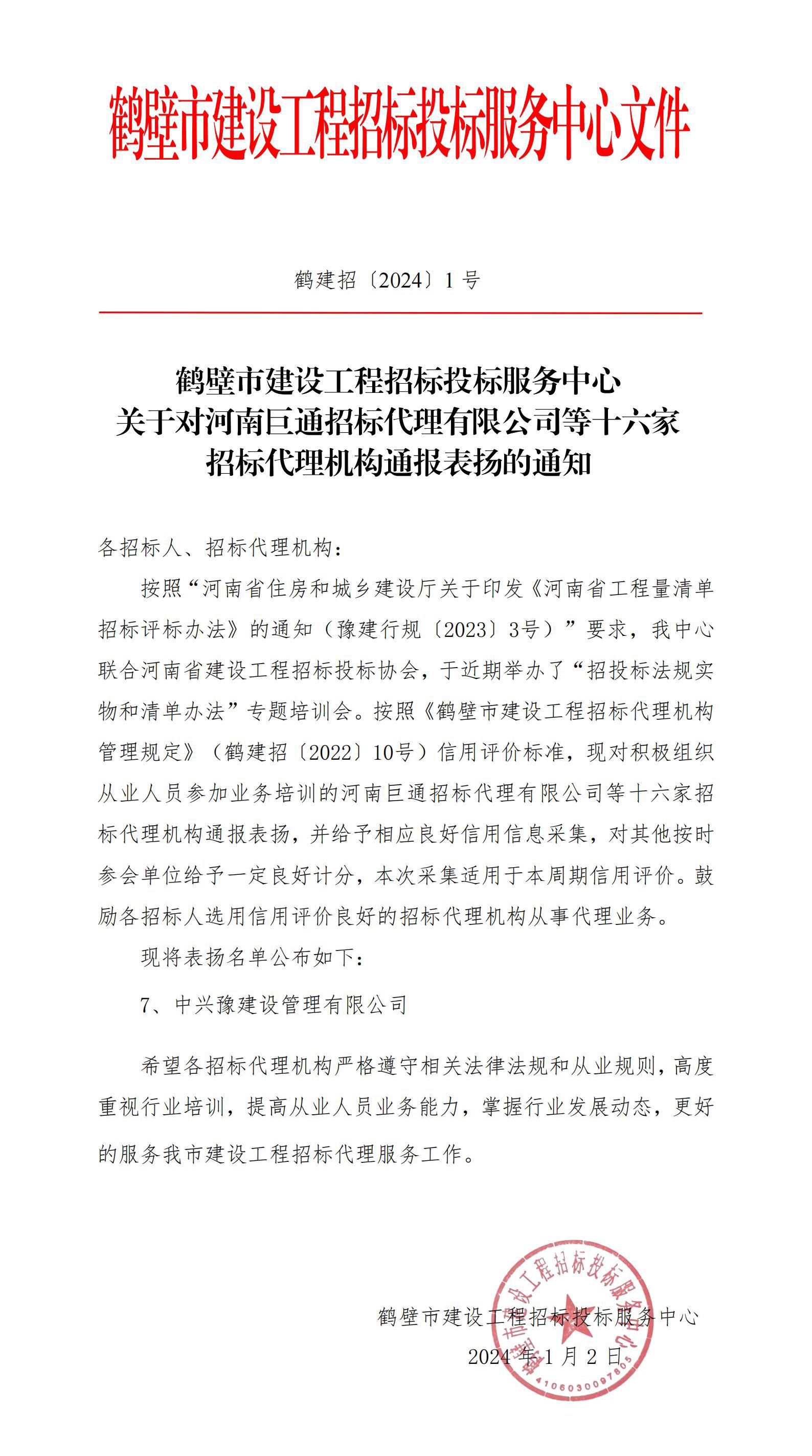 近日,鶴壁市建設(shè)工程招標(biāo)投標(biāo)服務(wù)中心發(fā)布了《關(guān)于對(duì)河南巨通招標(biāo)代理有限公司等十六家招標(biāo)代理機(jī)構(gòu)通報(bào)表?yè)P(yáng)的通知》,對(duì)積極組織從業(yè)人員參加業(yè)務(wù)培訓(xùn)的代理機(jī)構(gòu)通報(bào)表?yè)P(yáng),中興豫建設(shè)管理有限公司榜上有名,同時(shí)鼓勵(lì)各招標(biāo)人選用信用評(píng)價(jià)良好的招標(biāo)代理機(jī)構(gòu)從事代理業(yè)務(wù)。