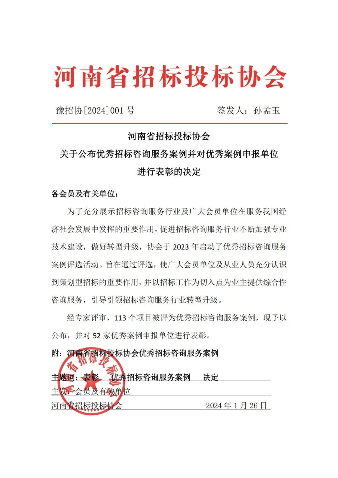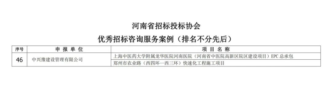 近日,河南省招標(biāo)投標(biāo)協(xié)會(huì)公布了“關(guān)于優(yōu)秀招標(biāo)咨詢服務(wù)案例并對(duì)優(yōu)秀案例申報(bào)單位進(jìn)行表彰的決定”。經(jīng)專家評(píng)審,中興豫建設(shè)管理有限公司入選其中,兩項(xiàng)工程被評(píng)為優(yōu)秀招標(biāo)咨詢服務(wù)案例。