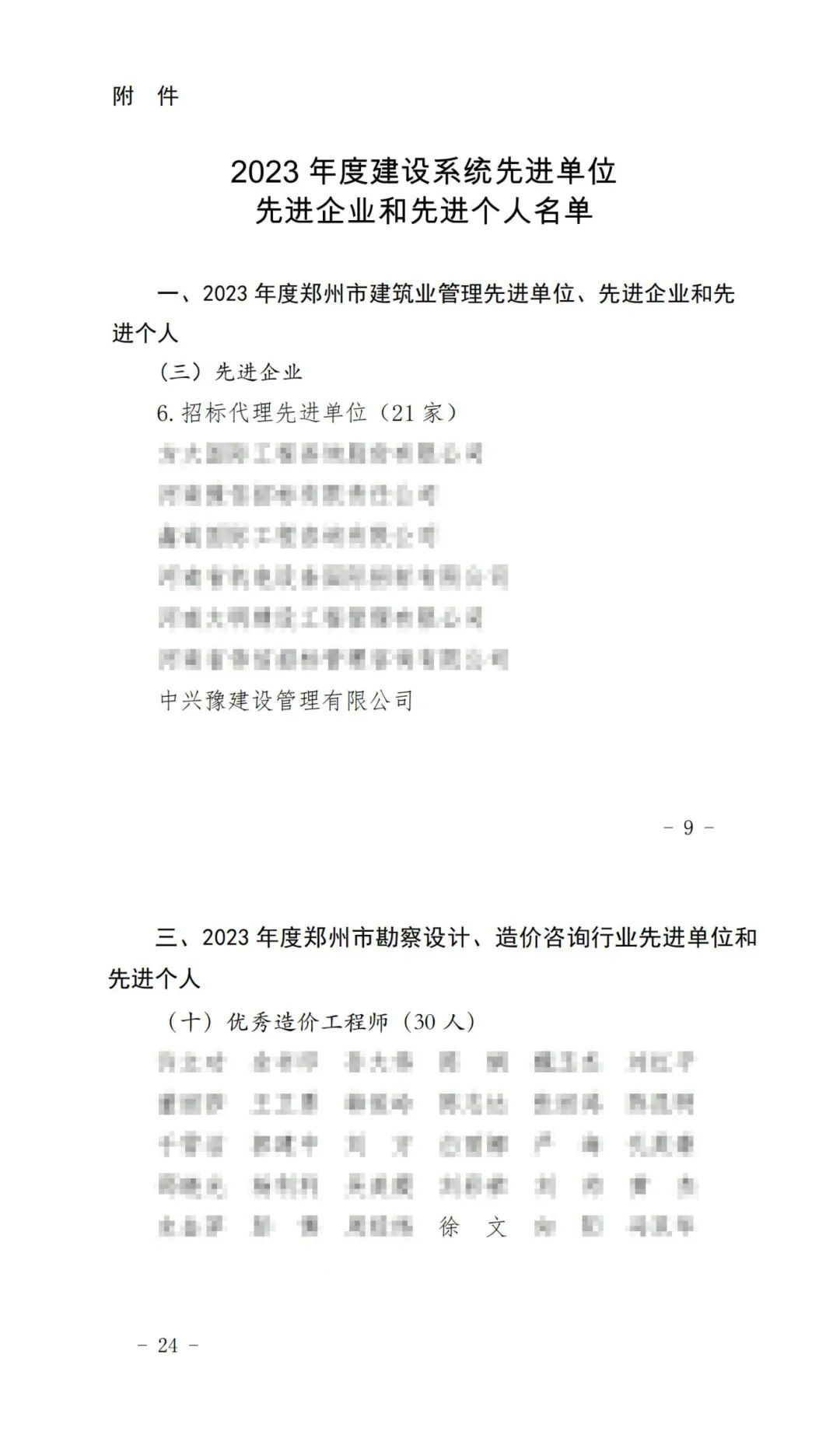 近日,鄭州市城鄉(xiāng)建設(shè)局公布了《關(guān)于表揚2023年度建設(shè)系統(tǒng)先進單位先進企業(yè)和先進個人名單的通報》,中興豫建設(shè)管理有限公司榮獲2023年度建設(shè)系統(tǒng)招標代理行業(yè)先進單位,造價師徐文榮獲優(yōu)秀造價工程師榮譽稱號!