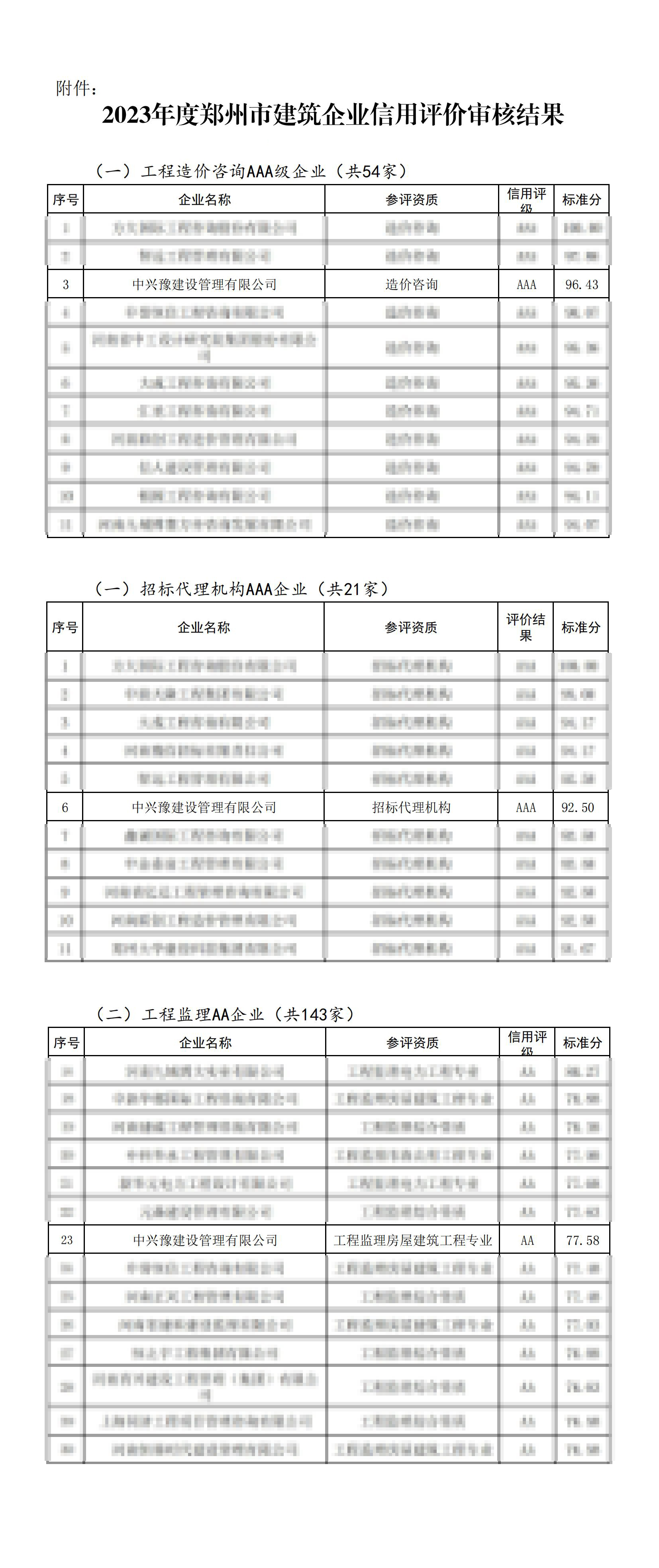 近日,鄭州市城鄉(xiāng)建設局發(fā)布了《關于2023年度鄭州市建筑企業(yè)信用評價審核結果的公示》,經單位申報、主管部門審核共同認定,中興豫建設管理有限公司再次榮獲工程造價咨詢AAA級企業(yè)、招標代理機構AAA級企業(yè)、工程監(jiān)理AA級企業(yè)!