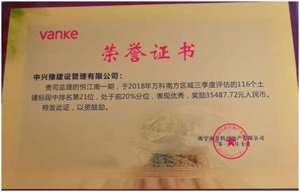 本項(xiàng)目在萬科房地產(chǎn)有限公司于2018年組織的南方區(qū)域三季度評估的116個(gè)土建標(biāo)段中位列第21位,處于前20%分位,表現(xiàn)優(yōu)秀,獲得優(yōu)秀標(biāo)段“榮譽(yù)證書”,并獲獎(jiǎng)金 35487.72元。