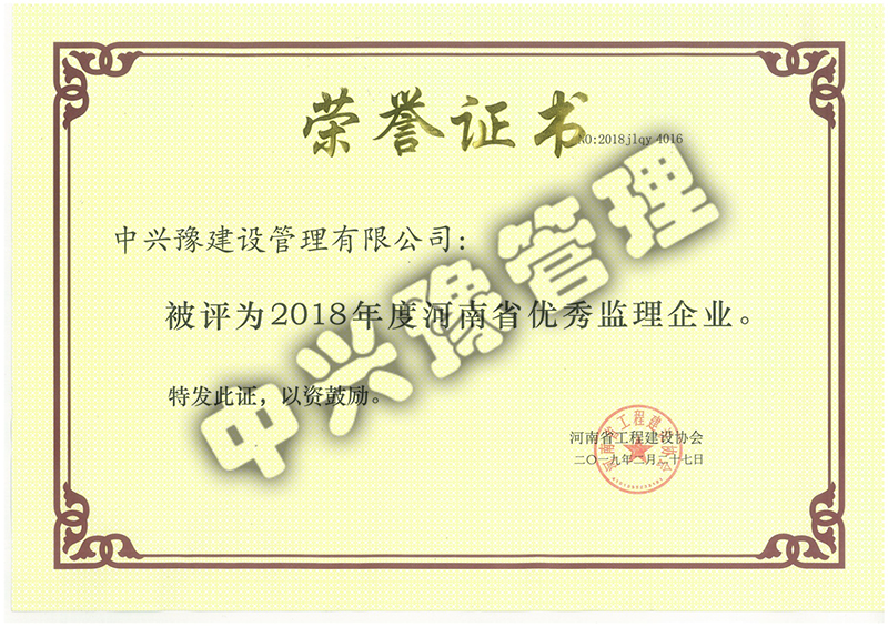 2018年度河南省工程建設(shè)優(yōu)秀監(jiān)理企業(yè)-公司榮譽(yù)
