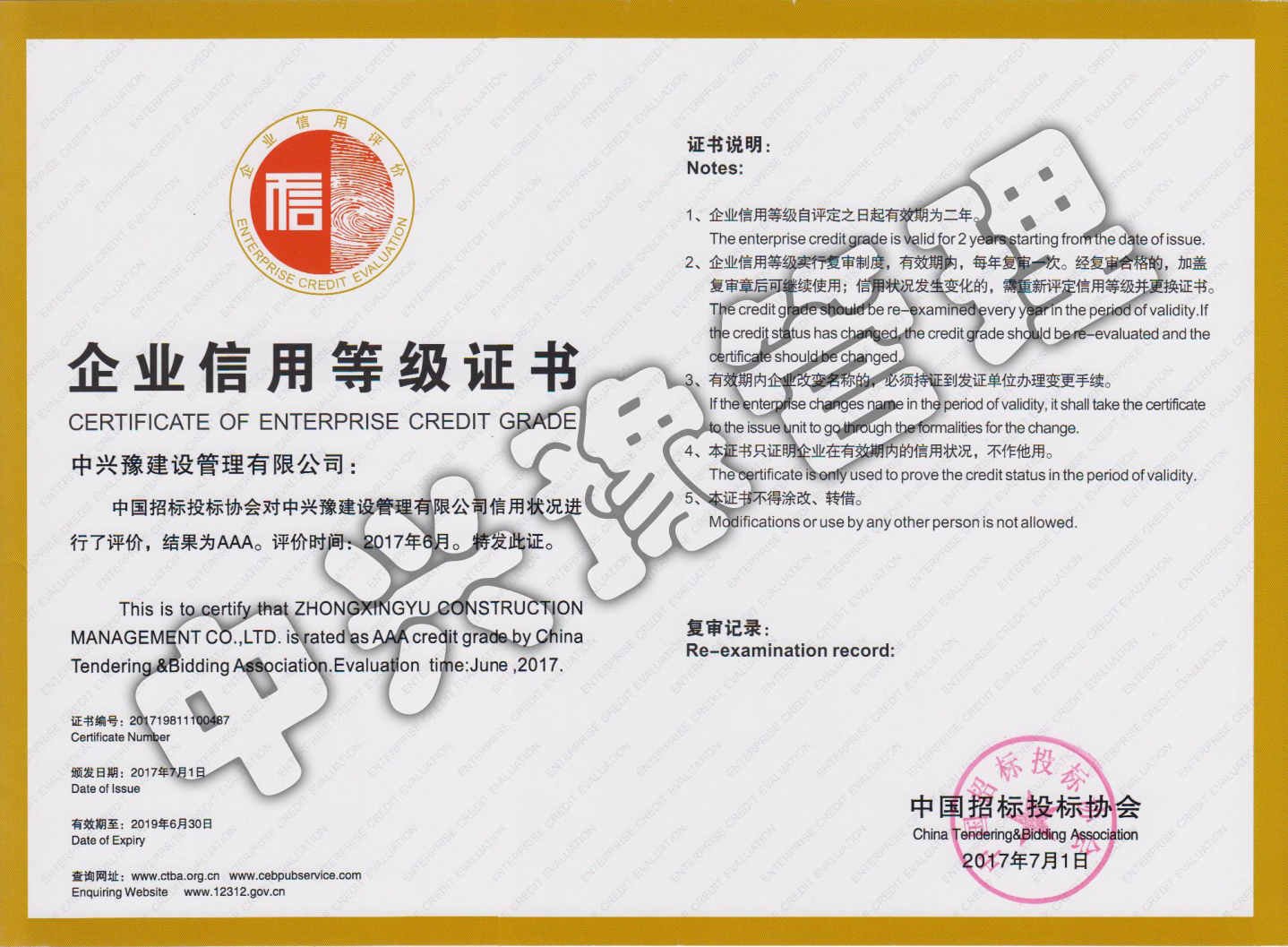 招標(biāo)投標(biāo)協(xié)會AAA信用等級單位-公司榮譽