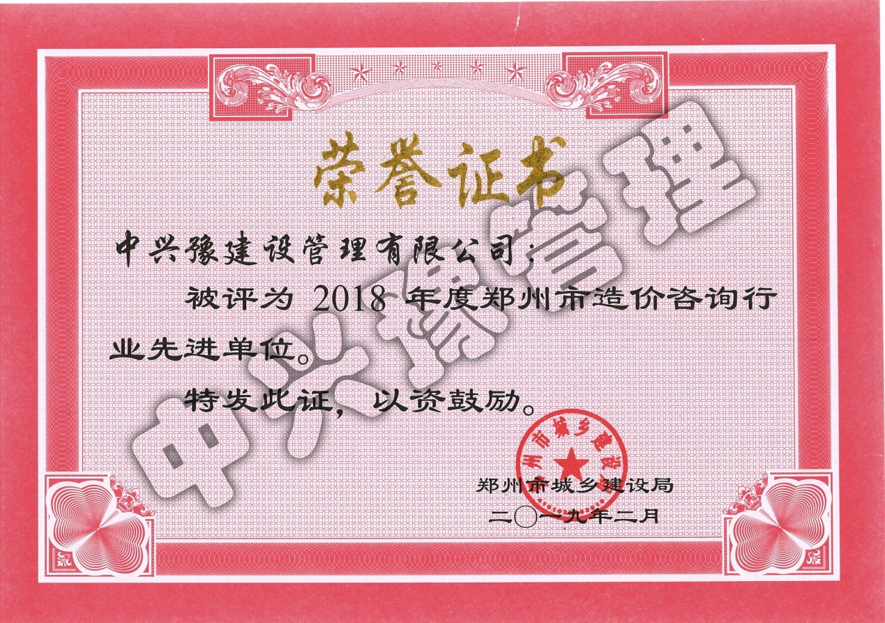 2018年度鄭州市造價(jià)咨詢行業(yè)先進(jìn)單位榮譽(yù)證書-公司榮譽(yù)